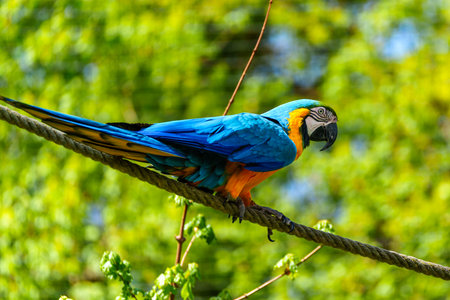 Close up portrait of a blue and yellow Macaw parrot sitting on a wooden perch against a lush green tropical garden. Exotic bird in a zoo looking at the camera. Bird watching.