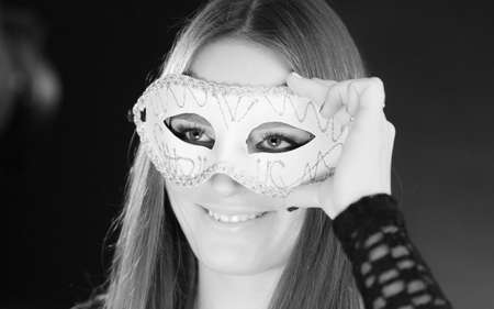 Party time, holidays, people and celebration concept. Woman long hair holding carnival mask close up. Black & white photo