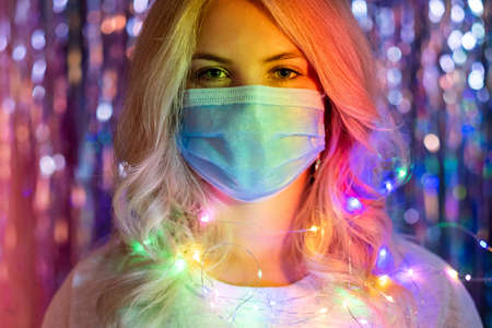 Pandemic Christmas. Covid-19 New Year party 2021. Winter holidays celebration hygiene. Portrait on blonde woman in protective face mask in rainbow neon lights on blur tinsel background.