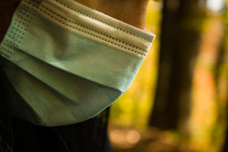Close up of woman face wearing medical protective mask in the nature