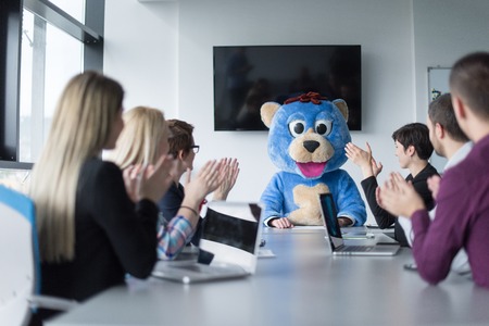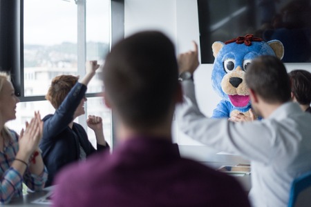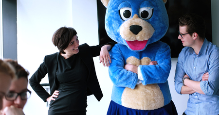 Boss dresed as teddy bear having fun with bussines people in modern corporate office
