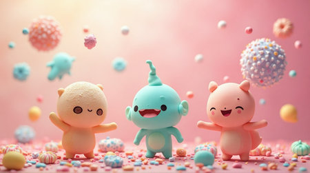 Three adorable cartoon creatures with happy expressions in a whimsical candy-themed environment