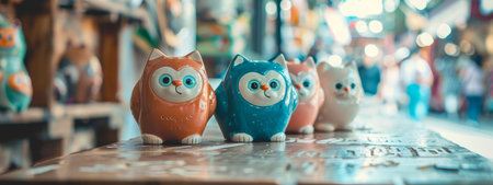A vibrant collection of cuddly characters, playfully arranged on a shelf in an indoor toy store, exuding a whimsical and cartoon-like charm