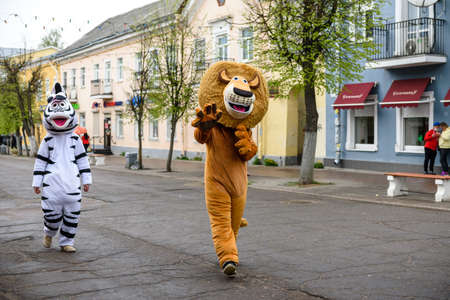 Russia, Gatchina, May 15, 2021: A man in a lion and zebra costume on a city street greets passers-by. Advertising on the street. Work in advertising.