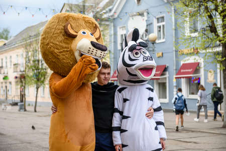 Russia, Gatchina, May 15, 2021: A man in a lion and zebra costume on a city street embraces and takes photos with passers-by. Advertising on the street. Work in advertising.