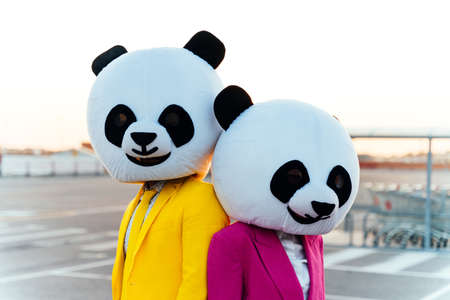 Storytelling image of a couple wearing giant panda head and colored suits. Man and woman making party in a parking lot.