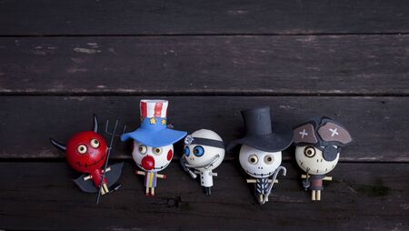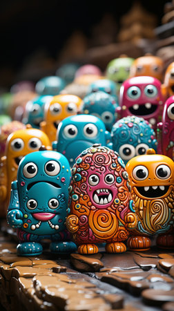 Group of toy monsters sitting on top of wooden table next to each other. Generative AI.