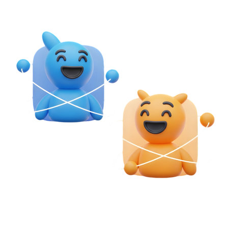 Charming 3D blue and orange characters, resembling cute cartoon figures, are depicted within abstract glowing shapes, with white atom like symbols orbiting them