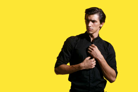 Portrait of a strong, fit, sexy male models, isolated on a yellow background, looking away, posing in studio, arranges his black shirt.