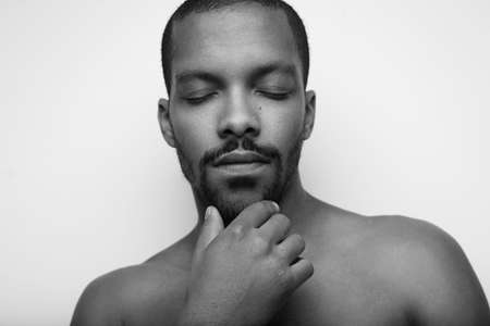 Black and white portrait of bald black man, touching his face. Isolated.
