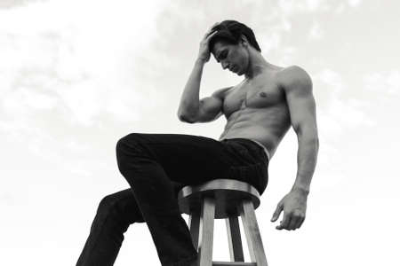 Handsome shirtless muscular young man posing outdoor. Photo white and black. Male model seated on chair.