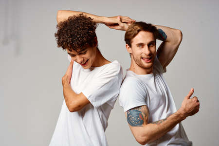 funny two men in white t-shirts are standing side by side isolated background