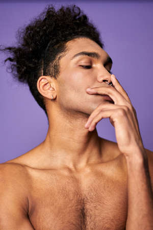 Young athletic man with fingers on face portrait. Transgender fashion style shot. Trans gender model
