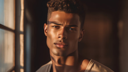 Beauty and skin care Highlydetailed close up portrait of goodlooking darkskinned young man with clean healthy glowing skin looking at camera with serious confident expres : Generative AI