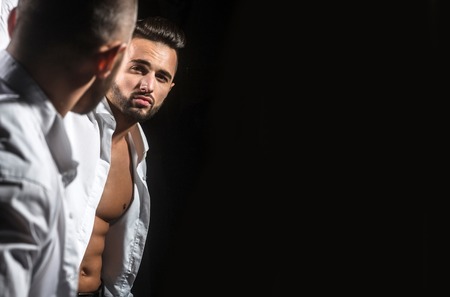 handsome muscular macho man or athlete guy with sexy body of bodybuilder with torso, belly, six packs, has beard on serious face in white shirt reflecting in mirror isolated on black background