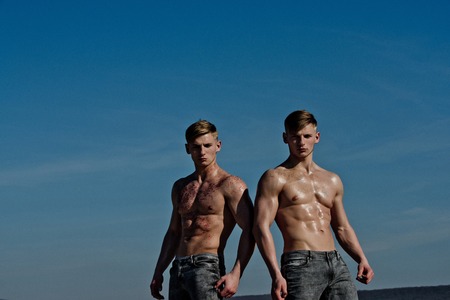 Sexy twins, macho men, muscular athletes and bodybuilders with strong, naked torsos, chests, bellies, six packs, abs, arms, biceps, triceps in jeans posing on evening sky. Sport and health