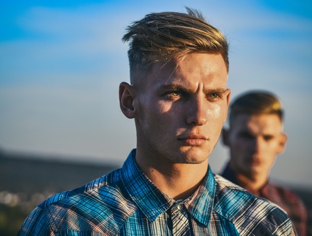 Partnership, future, support and trust. Fashion for men, summer. Twin brothers man outdoor, relations. Man twins with athletic body, family values. Men twins in sunset or sunrise, friendship.