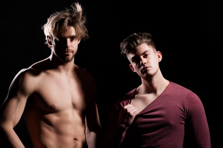 Shirtless male model naked posing in studio. Sexy gay couple fashion style. Muscular shirtless man. Stylish guys embracing pride and power. Handsome boyfriend in elegant outfit. Fashionable men.