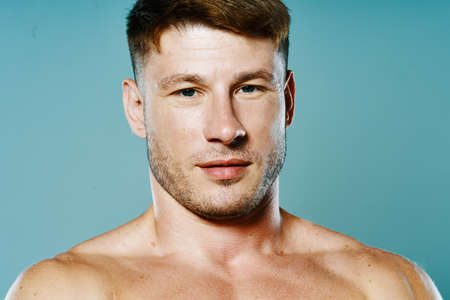 Sexy man with naked torso. Strong muscular male body, muscles guy. Confident attractive man with serious face.