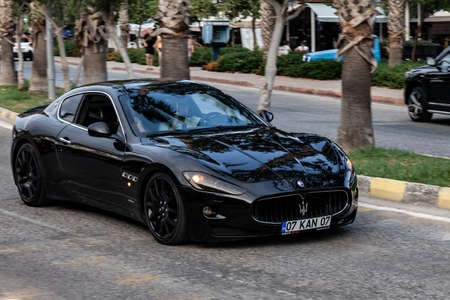 Kemer, Turkey - 08.31.2021: black Maserati GranTurismo is parked on the street on a warm summer day driving against the backdrop of a building, palms