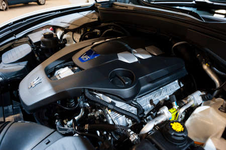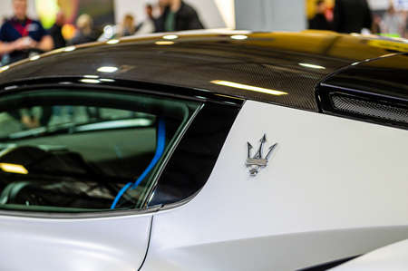 Ukraine, Kyiv - October 10, 2021: Close up logo Maserati. Presentation of new models Maserati