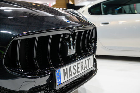 QUEZON CITY, PH - APR 13 - Black Maserati emblem at Rev up car show on April 13, 2019 in Quezon City, Philippines.