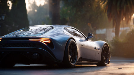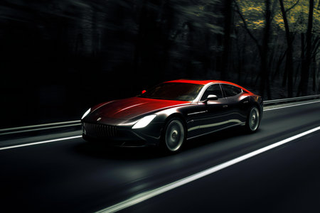 Shiny sports car speeds on modern road, chrome bumper reflects light generated by artificial intelligence