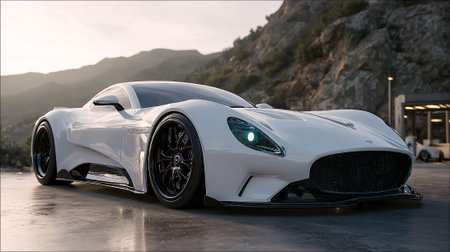Sleek White Car Parked Near Mountains with Reflected Pavement