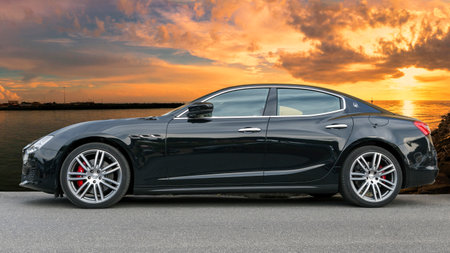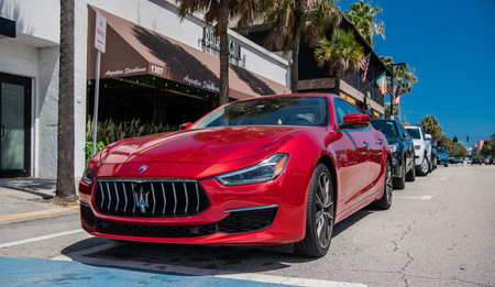 Miami, Florida, USA - December 06, 2024: Maserati Ghibli 2025 sportscar. Luxury sport car of Maserati Ghibli. Car of Maserati Ghibli parked outdoor. Maserati Ghibli, corner view
