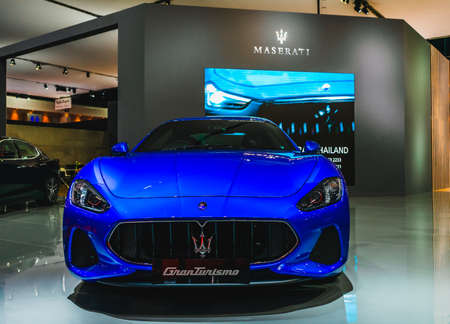 Bangkok, Thailand - September 14, 2019: Blue luxury coupe Maserati GranTurismo presented at auto show, Maserati Granturimo produced by Italian car manufacturer Maserati