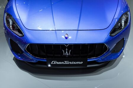 Thailand - April 3, 2019: close up front view of Maserati granturismo blue color luxury car presented in motor show Thailand .