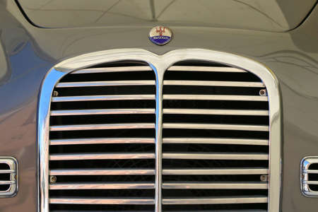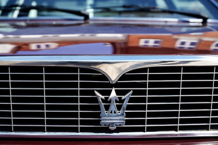 RATZEBURG, GERMANY - JUNE 2, 2019: maserati, grille with trident logo emblem on a classic automobile at the oldtimer car meeting in Ratzeburg