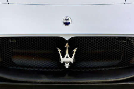 MODENA - ITALY - September 10, 2020 - Front grill of the new Maserati MC20, detail of the brand