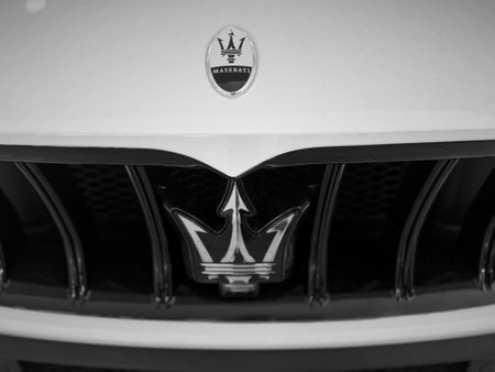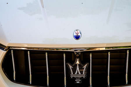 Mandello del Lario, Italy - May 25, 1019: Illustrative editorial close up shot of the Maserati logo on a car. Maserati is an Italian luxury vehicle manufacturer.