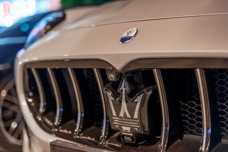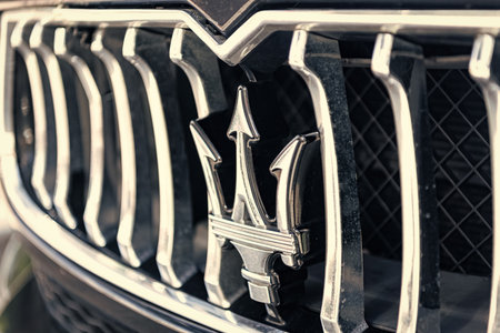 Ukraine, Odessa - September 8, 2021: Maserati logo on the front of the car. Maserati car front grill with trident logo Italian brand of luxury cars.
