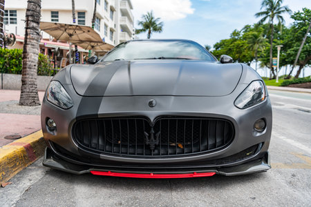 Miami, Florida, USA - July 27, 2025: Luxury gran Turismo car Maserati. Car coupe Maserati parked outdoor. Black matte car, front view. Maserati Gran Turismo 2015 coupe car.