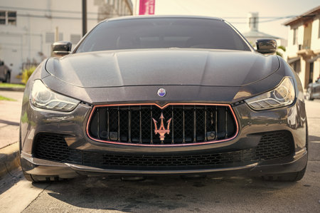 Miami, Florida, USA - December 06, 2024: Maserati Ghibli 2025 sportscar. Luxury sport car of Maserati Ghibli. Car of Maserati Ghibli parked outdoor. Maserati Ghibli, front view.
