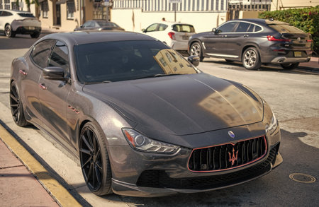 Miami, Florida, USA - December 17, 2024: 2014 Maserati Ghibli sportscar. Luxury sport car of Maserati Ghibli model. Car of Maserati Ghibli parked outdoor. Maserati Ghibli, corner view