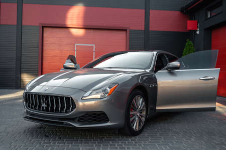 Ukraine, Odessa - September 8, 2021: Maserati sedan luxury expensive car parked near the garage with open doors.