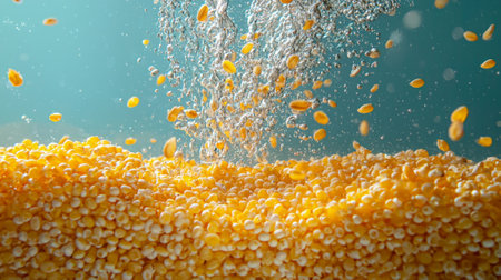 Corn grits are suspended water illustrating their unique shapes and textures as they float separately bright background creating engaging visual effect.