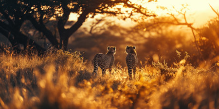a pair of cheetahs can be seen at sun down, in the style of color gradients, lens flare, traditional landscapes.