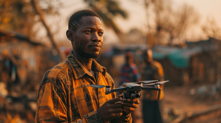 Young african man with drone in his hands at village in Africa, sunset.