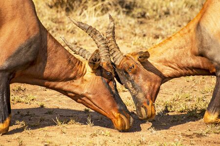 Head of fighting Topis antelope, (Damaliscus lunatus jimela), Serengeti National Park, Tanzania.
