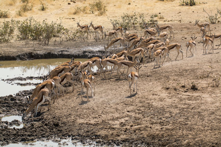 a herd of impalas drinking and standing at a waterhole in the Etosha national park in Namibia