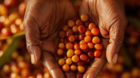 Hands cradle vibrant coffee berries, freshly harvested, showcasing the beauty of nature and the joy of agriculture in a rustic setting.