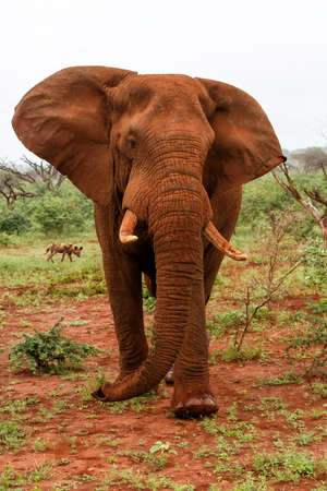 Large adult elephant (Loxodonta) stands covered in red dust Etosha National Park, Namibia