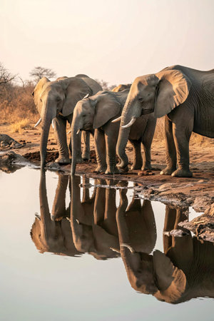 Elephants drinking seen from a low angle at a waterhole in Mashatu Game Reserve in the Tuli Block in Botswana