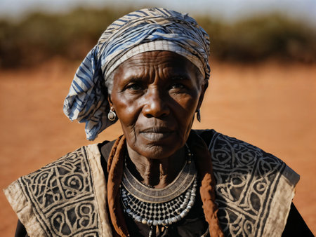 Portrait of an elderly African woman in traditional attire on a black background, close-up.