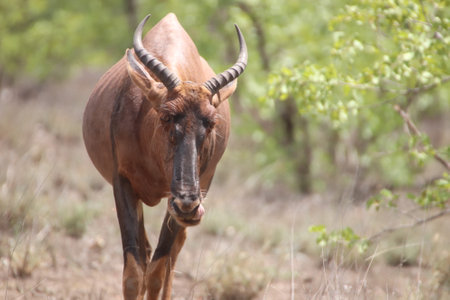 Tsessebe (Damaliscus lunatus lunatus) social grazers with 'halfmoon' shaped horns. Walking to grazing veld and alert of danger. In the Kruger National Park of South Africa.