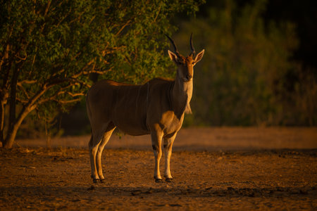 Male common eland stands sidelit by bushes